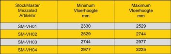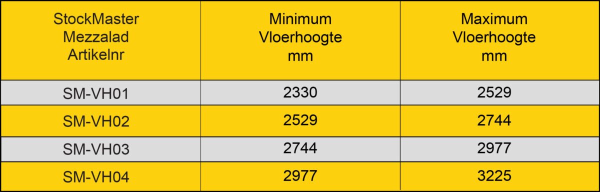 Stockmaster Mezzalad past zich aan aan de hoogte van de tussenvloer door automatisch de hellingshoek te veranderen tussen 60° en 70°. De werkhoogtes kunt u in de tabel vinden.