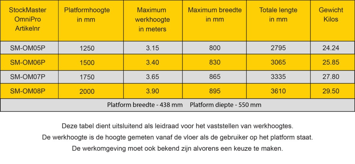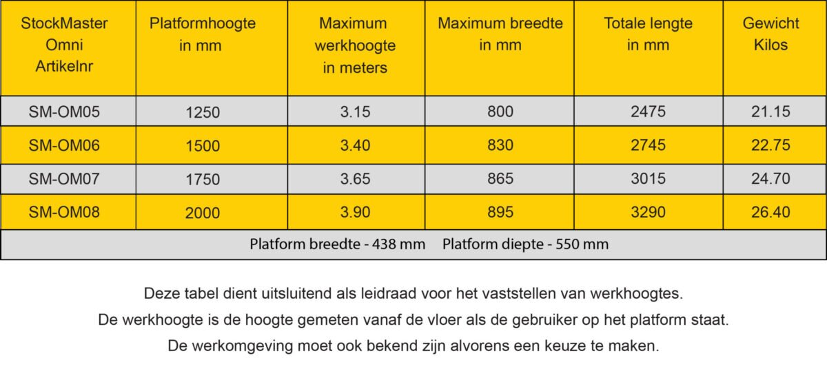 Voor het kiezen van de juiste StockMaster voor uw toepassing is het noodzakelijk om kennis te hebben van de werkomgeving en de uit te voeren werkzaamheden. Lees de informatie hier beneden over de werkomgeving en uit te voeren werkzaamheden en kies dan de juiste maat uit de tabel onderaan de pagina.